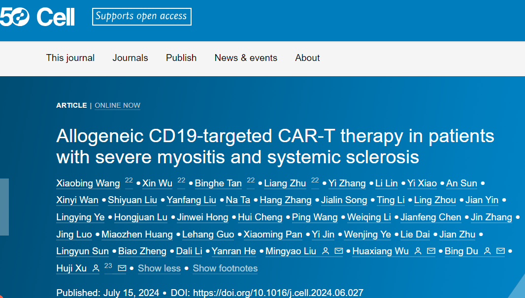TyU19是一种“off-the-shelf”CAR-T细胞治疗产品,即将来自健康人体的T细胞制备成靶向CD19的CAR-T细胞后,顺利获得CRISPR-Cas9基因编辑技术敲除HLA-A、HLA-B、CIITA、TRAC和PD-1等基因,解决异体CAR-T疗法中免疫排斥的问题。本文报道了TyU19用于治疗1例难治性免疫介导性坏死性肌病(SPR-IMNM)患者和2例弥漫性皮肤系统性硬化症(dcSSc)患者,输注的TyU19在体内持续存在超过3个月,实现了完全B细胞耗竭。在6个月的随访期内,患者未出现细胞因子释放综合征或其他严重不良事件,相应疾病的临床反应指数评分显著改善,达到深度缓解。